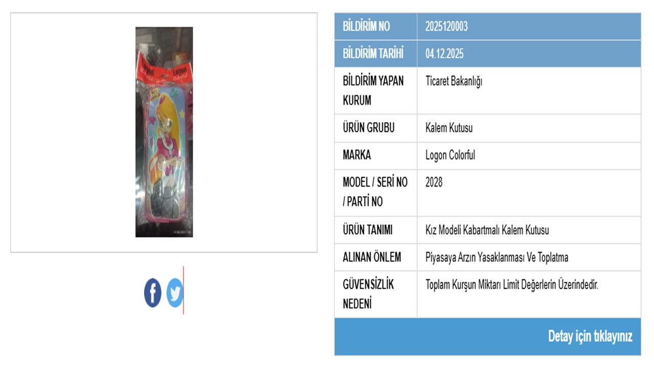 Model ve seri numarası “2028” olan kalem kutusunun piyasadan toplatılmasına karar verildi. Bakanlık, denetimlerin devam ettiğini vurgulayarak hem yerli hem de ithal tüm ürünlerde kontrollerin sıklaştırılacağını duyurdu.
