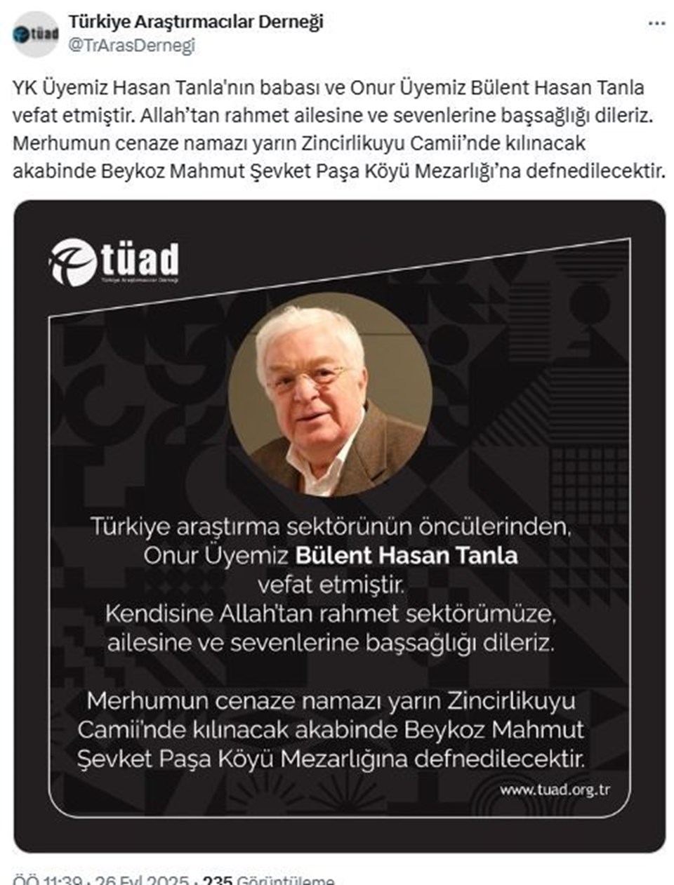 Türkiye Araştırmacılar Derneği tarafından yapılan açıklamada; “YK Üyemiz Hasan Tanla’nın babası ve Onur Üyemiz Bülent Hasan Tanla vefat etmiştir. Allah’tan rahmet ailesine ve sevenlerine başsağlığı dileriz.