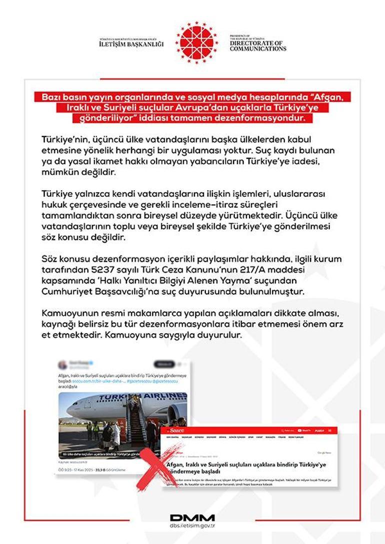 DMM’nin sosyal medya hesabından yapılan açıklamada, “Bazı basın yayın organlarında ve sosyal medya hesaplarında ‘Afgan, Iraklı ve Suriyeli suçlular Avrupa’dan uçaklarla Türkiye’ye gönderiliyor’ iddiası tamamen dezenformasyondur. Türkiye’nin, üçüncü ülke vatandaşlarını başka ülkelerden kabul etmesine yönelik herhangi bir uygulaması yoktur. Suç kaydı bulunan ya da yasal ikamet hakkı olmayan yabancıların Türkiye’ye iadesi, mümkün değildir. Türkiye yalnızca kendi vatandaşlarına ilişkin işlemleri, uluslararası hukuk çerçevesinde ve gerekli inceleme–itiraz süreçleri tamamlandıktan sonra bireysel düzeyde yürütmektedir. Üçüncü ülke vatandaşlarının toplu veya bireysel şekilde Türkiye’ye gönderilmesi söz konusu değildir. Söz konusu dezenformasyon içerikli paylaşımlar hakkında, ilgili kurum tarafından 5237 sayılı Türk Ceza Kanunu’nun 217/A maddesi kapsamında ‘Halkı yanıltıcı bilgiyi alenen yayma’ suçundan Cumhuriyet başsavcılığına suç duyurusunda bulunulmuştur. Kamuoyunun resmi makamlarca yapılan açıklamaları dikkate alması, kaynağı belirsiz bu tür dezenformasyonlara itibar etmemesi önem arz et etmektedir” denildi.