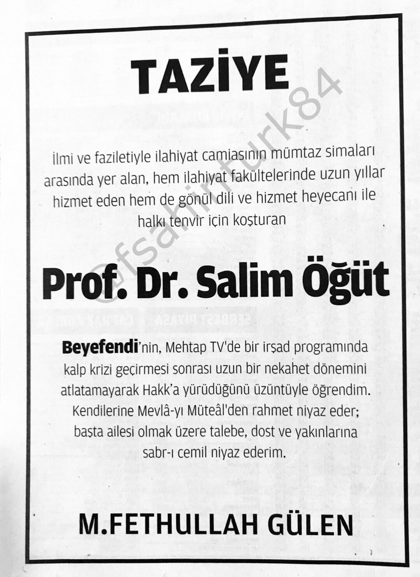 “İlmi ve faziletiyle ilahiyat camiasının mümtaz simaları arasında yer alan, hem ilahiyat fakültesinde uzun yıllar hizmet eden hem de gönül dili ve hizmet heyecanı ile halkı tenvir için koşturan Prof. Dr. Salim Öğüt Beyefendi’nin, Mehtap TV’de bir irşad programında kalp krizi geçirmesi sonrası uzun bir nekahet dönemini atlatamayarak Hakk’a yürüdüğünü üzüntüyle öğrendim. Kendilerine Mevlâ-yı Müteal’den rahmet niyaz eder; başta ailesi olmak üzere talebe, dost ve yakınlarına sabr-ı cemil niyaz ederim.”